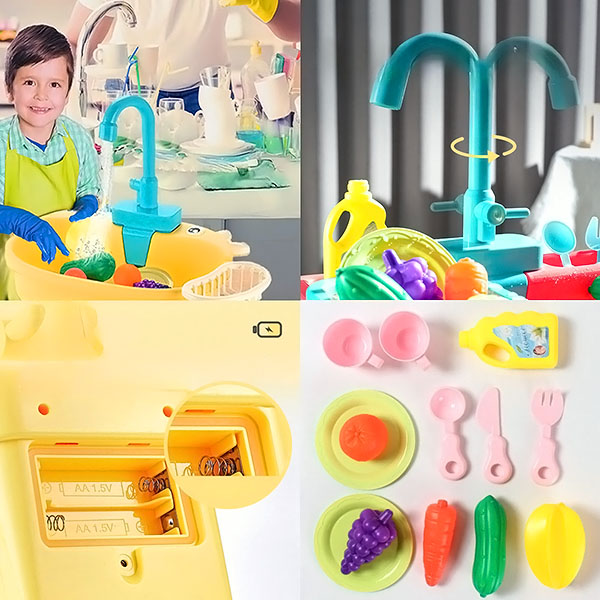Ergonomický design je ideální pro batolata, kohoutek se snadno ovládá a nastavení je jednoduché na manipulaci. Stisknutím tlačítka mohou děti aktivovat proud vody a začít si hrát. Je to pro ně skvělý způsob, jak si osvojit základní kuchyňské úkony a zároveň posílit koordinaci rukou a očí a jemnou motoriku.