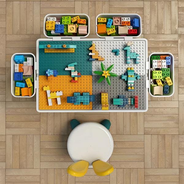Stůl je použitelný z obou stran, přičemž jedna strana je určena k sestavování bloků a druhá má rovnou plochu.