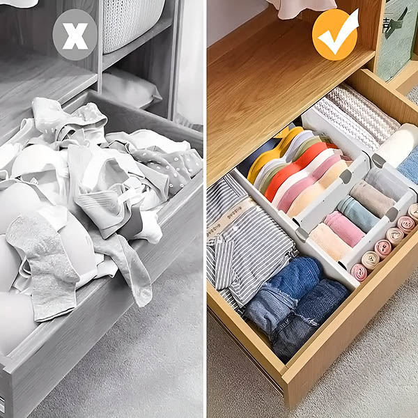 Ať už jde o kuchyňské náčiní, koupelnové potřeby nebo ponožky v ložnici, tyto přepážky se dají nastavit od 28 cm do 45 cm, aby se přizpůsobily většině zásuvek. Můžete si prostor upravit přesně podle svých potřeb.